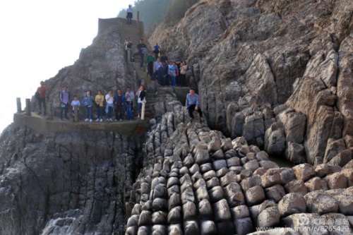 五百羅漢:因海水與巖崖不斷撞擊,歷盡無數(shù)歲月,海蝕成數(shù)十排獨(dú)立的崖石,仿佛是羅漢打座,面朝大海,呻吟著佛經(jīng),護(hù)佑蒼生,多么神奇的力量。董事長李德進(jìn)笑坐羅漢群之上。